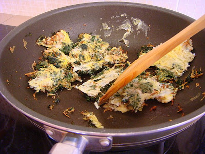 把姜渣及艾草混合然后摊平,打两粒新鲜鸡蛋在上面,类似煎洋葱蛋般。